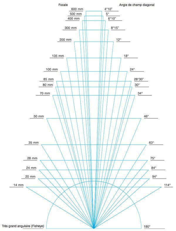 La distance exprimée en millimètres détermine aussi la largeur du champ de vision (en degrés) appelé aussi en anglais, Field of View (FOV).