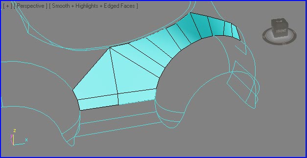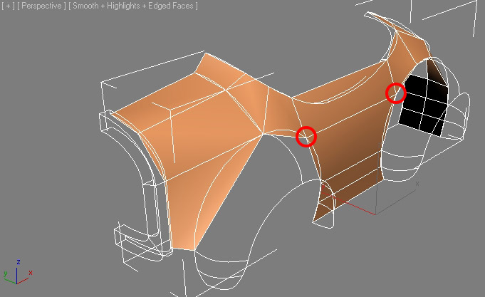 Cette approche produit 1 «pincement» triangulaire au niveau des 2 ailes de la voiture : visible ici au moment du lissage maillage sur l'arrière de l'aile avant-droite.
