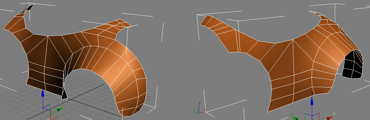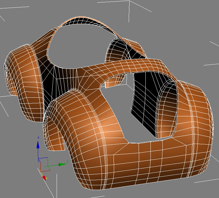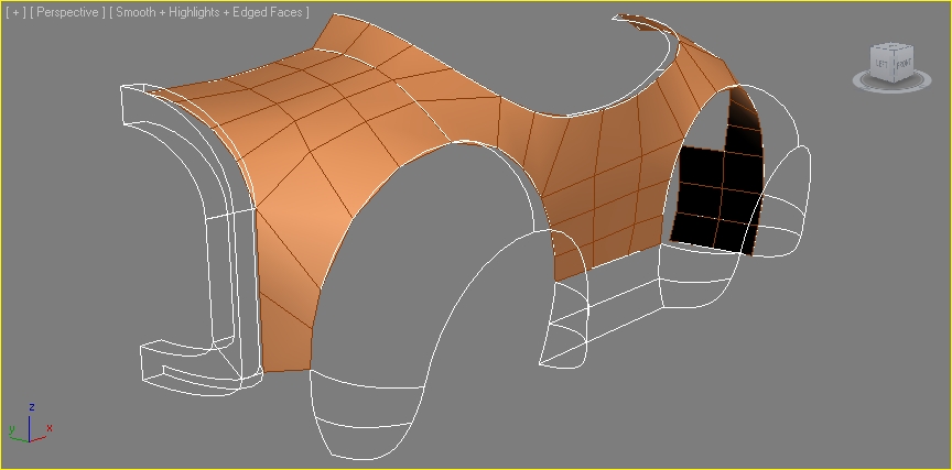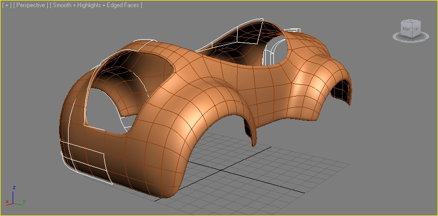 - Enfin, le reste de la carrosserie est réalisé avec un petit plan non subdivisé dont on extrude les arêtes et coupe les polygones à l'aide du modificateur Editer maillage en mode sous-objet / arête (edge) ou polygone.