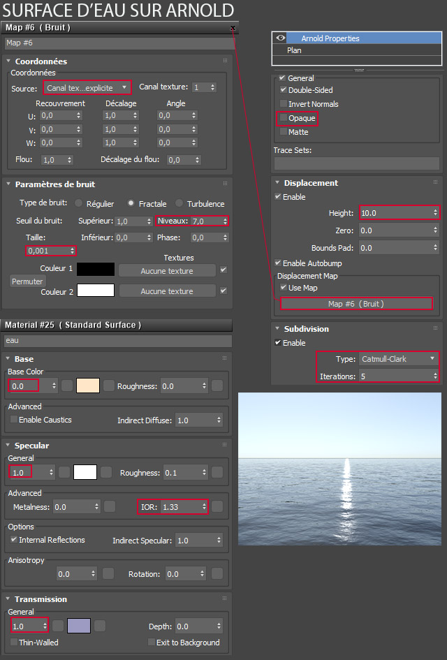 - Une particularité d'Arnold à noter : le paramètre «Echelle» de l'objet plan ne peut pas dépasser 100. Il faut donc augmenter la taille initiale du plan en conséquence et diviser dans la même proportion la taille du bruit comme dans l'exemple ci-dessus.